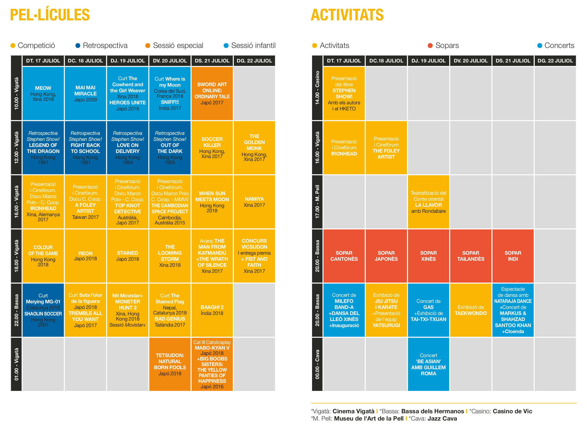 Un total de 35 películas conforman la programación de este año, 18 de ellas en la sección oficial competitiva y el resto repartidas entre la retrospectiva Taiwan Excellence, las sesiones infantiles y sesiones especiales como la noche Grindhouse o la maratón de cine fantástico filipino. Una cartelera que se caracteriza por la variedad de géneros, con un equilibrio entre obras de corte claramente cinéfilo, con grandes virtudes artísticas, y otras con un objetivo puramente comercial, con un diseño de producción espectacular y cualidades para atrapar al gran público. Podrás encontrar toda la programación clicando aquí.